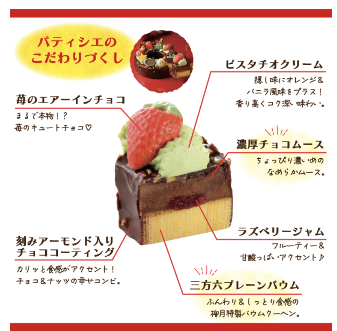 柳月の大定番、三方六プレーンの生地に、ラズベリージャムを絞り、上からチョコムースを流し込みました。 刻みアーモンド入りのチョコレートでコーティングし、ピスタチオクリームを絞り、色とりどりのチョコレート、ピスタチオをちらしてリースのように仕上げました。