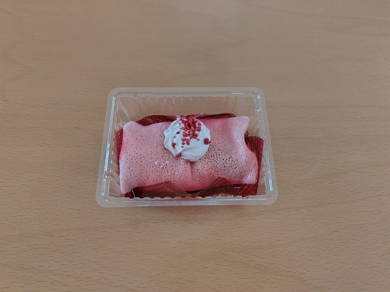 クレープ生地でスポンジ生地といちごクリーム、いちごダイス入りのいちごソースを包み いちごチップを乗せたクレープです。